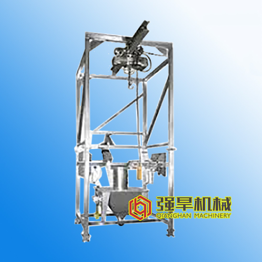 1.通过叉车或打开安装在吨袋拆包机设备支架上的电动葫芦开关,操纵叉车或者将吨袋固定在吨袋吊架上提升至进料口