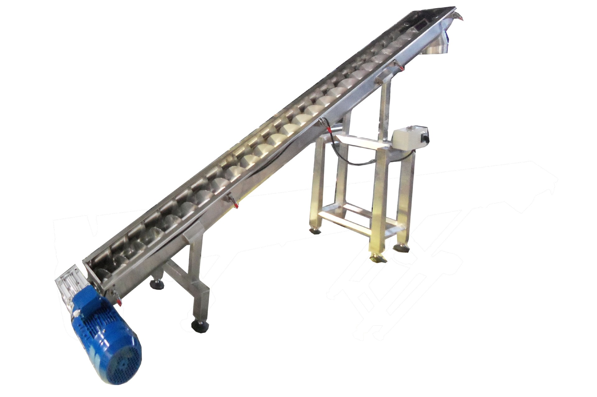 上料管为U型槽,槽上有不锈钢圆弧盖,用卡扣扣紧,中间用密封条密封,不漏粉,打开盖子便可方便清洗。