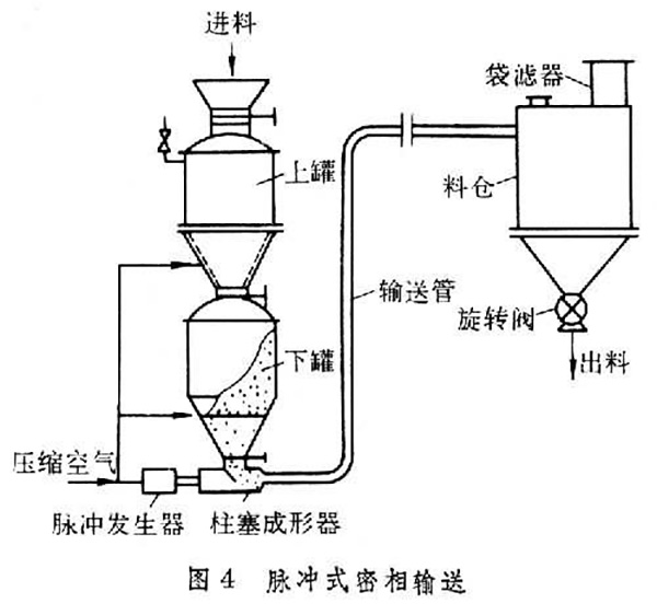脉冲式输送(图4)。是将一股压缩空气通入下罐,将物料吹松;另一股频率为20~40min-1脉冲压缩空气流吹入输料管入口,在管道内形成交替排列的小段料柱和小段气柱,借空气压力推动前进。