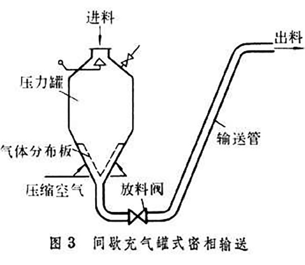 间歇充气罐式密相输送(图3)。是将颗粒分批加入压力罐,然后通气吹松,待罐内达一定压力后,打开放料阀,将颗粒物料吹入输送管中输送。